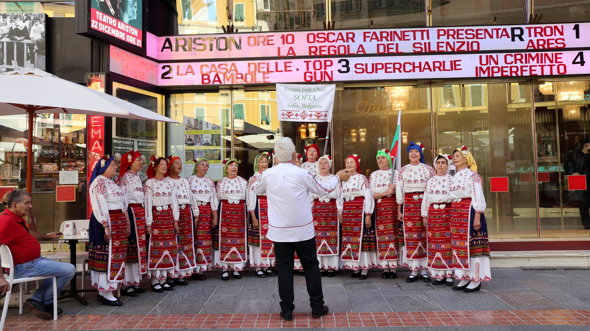 2025 in France and Italy. In the cities of San Remo, Cannes, Nice, Monte Carlo, and Diano Marina, we presented a program of Bulgarian folk songs from all ethnographic regions of our country in arrangements by Stefan Kunev, Georgi Ganev, Georgi Andreev and Ivaylo Hristov. Our acapella program was enthusiastically received everywhere, both by the large audience and by the other festival participants, who gathered on the French and Italian Riviera from all over Europe – gallery.